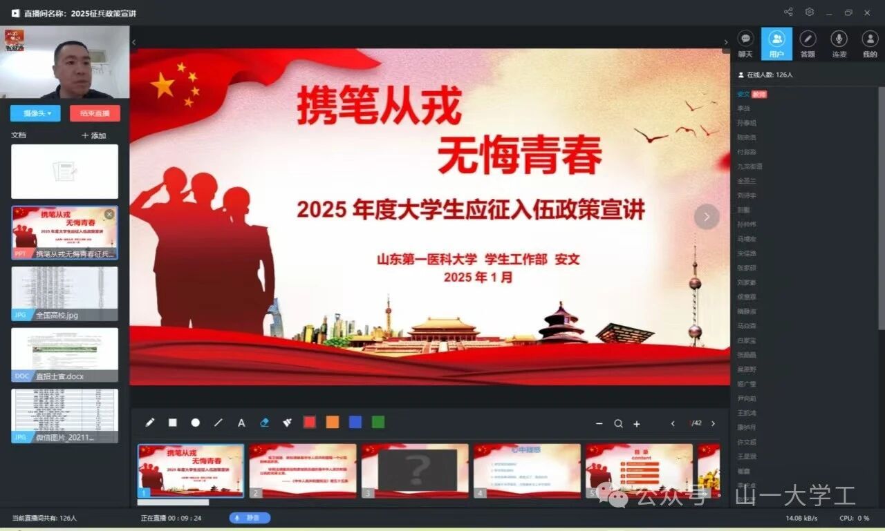 为响应国家征兵号召,切实做好2025年度春季征兵工作,促进征兵工作家校联通。2025年1月20日,校(院)以“家校同育,共筑国防”为主题举办2025年线上征兵政策宣讲及报名指导集体家访活动。