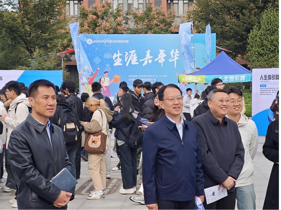 活动中,贾海宁深入关卡区域,与学生交流“职业飞行棋”“专业大探秘”等关卡体验,听取活动组织团队关于关卡设计、参与数据及服务保障的汇报。他强调,“生涯嘉年华”是学校深化生涯教育的重要载体,要结合医学及相关学科特色,强化“体验育人”“实践育人”,融合专业资源与生涯探索,让学生在互动中感受职业魅力、关联专业方向;他鼓励活动组织团队要进一步优化活动内容,围绕学生职业需求设计探索环节,助力学生认清优势、明晰路径,将活动打造成推进生涯规划教育、培养高素质应用型人才的重要平台。