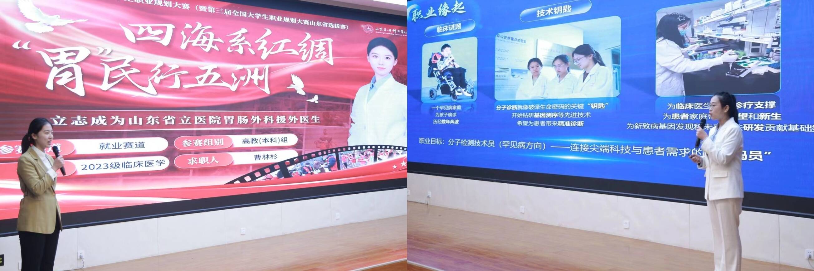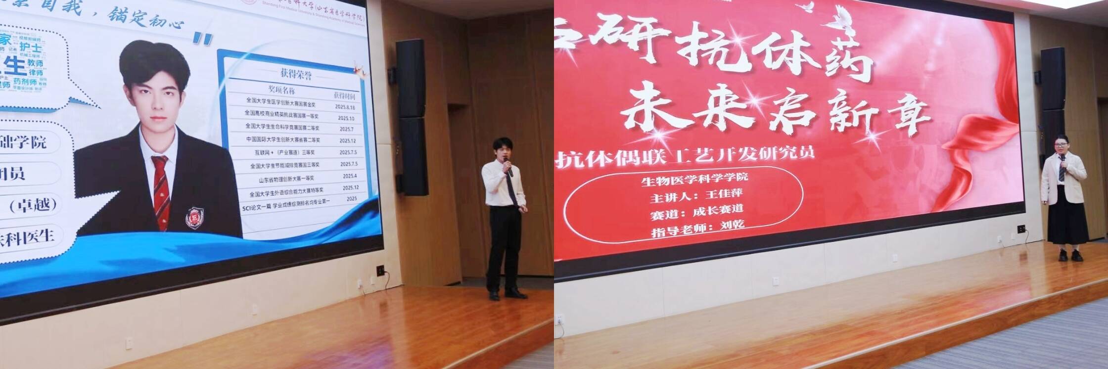 经过职业目标合理性、规划科学性、实践可行性及现场表现力等维度的综合展示,最终成长赛道牛宝硕、王佳萍获得金奖,陈悦、朱梦晨、初均璐获得银奖,王嘉慧、郑铭珈、于晓斌、孙蕾环、张名振获得铜奖;本科生就业赛道曹林衫、王姝懿获得金奖,张凯莉、徐晓雨、杨雨婷、蔡春稷获得银奖,李琬琦、姚骁洳、张渺辀、刘婧婷、罗一洋、胡桂苗获得铜奖;研究生就业赛道魏怡凡获得金奖,郑学真获得银奖,谢良玉、赵若琳获得铜奖。岳芸、刘乾、李欣萍、 杨兴廷、张一航获评“优秀指导教师”,生物医学科学学院、临床与基础医学院、医药管理学院获评“优秀组织奖”。